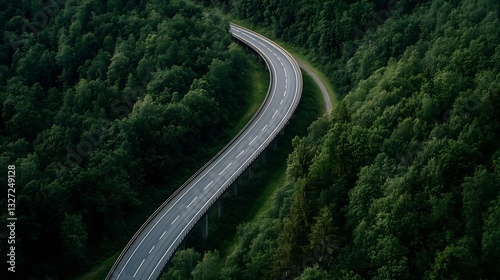 Aerial View of Winding Road Through Lush Green Forest Surrounded by Nature : Generative AI