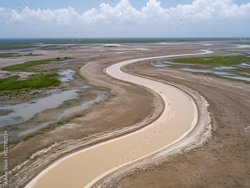 Aerial view of winding silt trail in vast delta with muddy water and patches of green vegetation under cloudy sky, showcasing natural landscape and water flow