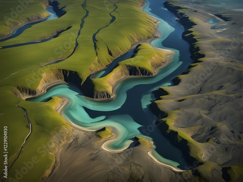 Aerial view perpendicular top down of an abstract colorful river along the coastline, AI generated