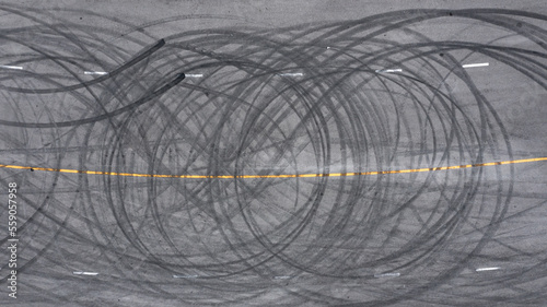 Aerial view tire track mark on asphalt tarmac road race track texture and background, Abstract background black tire track skid on asphalt road, Tire mark skid mark on asphalt road.