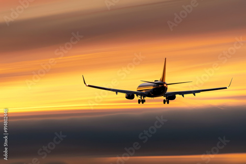 Aeroplane flying above the clouds and the setting sun in the background. AI generative.