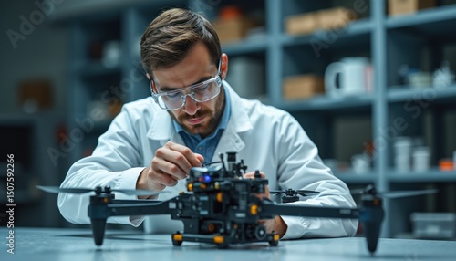 Aerospace engineer assembles prototype drone in research laboratory. Man in white coat works with glasses. Focus on tech innovation and precision, science tech. Modern UAV, drone tech.