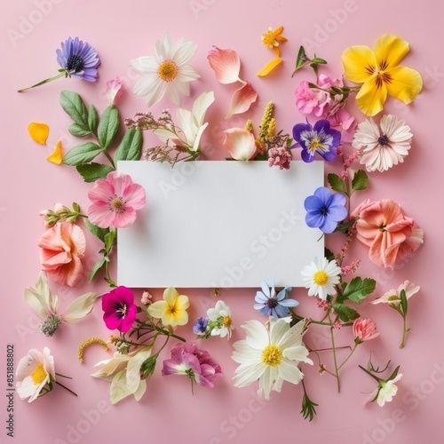 Aesthetic background with colourful flowers. Beautiful floral template composition. Wreath frame with blank copy space mock up paper card sheet.