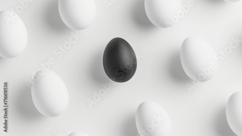 Aesthetic flat lay of white eggs with one black egg White background. Creative accent concept. Copy space. Generative AI