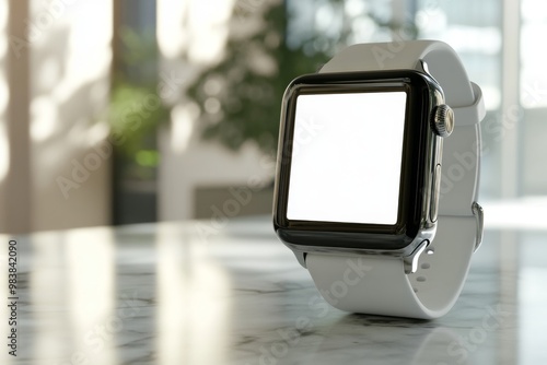 aesthetic mockup of smart watch with blank white screen on marble table