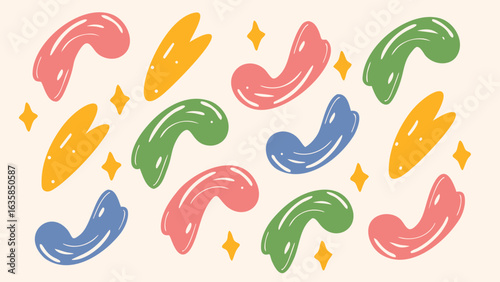 Aesthetic pattern with colorful abstract shapes and sparkling stars on a cream colored background design