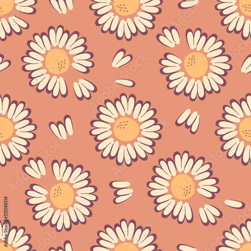 Aesthetic seamless pattern with daisies in hippie style. Simple floral print for T-shirt, poster, fabric, textile. Hand drawn vector illustration for decor and design.