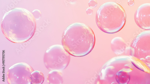 Aesthetic transparent soap bubbles floating on a pastel pink background. Detergents and cleaning products. Generative AI