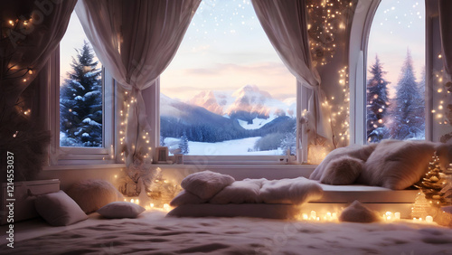 Aesthetic winter bedroom with fairy lights, fluffy pillows, and a snow view through the window ,General AI