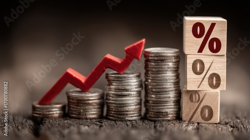 Aesthetic Wooden Block With Red Arrow Indicating Increasing Coin Stack, Ideal for Business GrowthFocused Campaigns or Presentations, Inspiring Determination and Success.