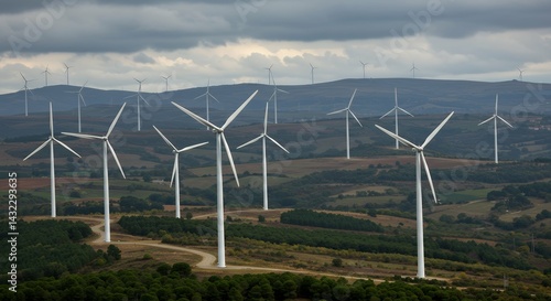 aesthetically pleasing view multiple devices convert air movement energy standing elevated terrain surrounded dense green wooded areas under cloudy sky distant mountain visible specific region