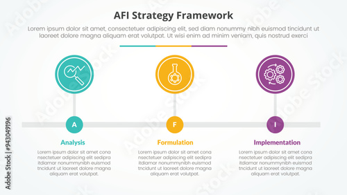 AFI framework strategy infographic concept for slide presentation with big circle outline horizontal timeline with 3 point list with flat style