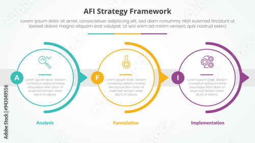 AFI framework strategy infographic concept for slide presentation with big outline circle horizontal right direction with 3 point list with flat style