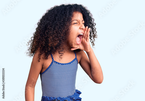 African american child with curly hair wearing swimwear shouting and screaming loud to side with hand on mouth. communication concept.