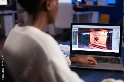 African american game developer testing new game working late at night in creativity agency company. Tired creator designer developing online video games on pc using modern production technology