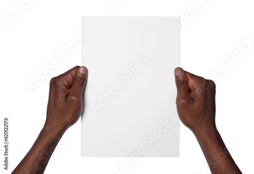 African American man holding sheet of paper on white background, closeup. Mockup for design
