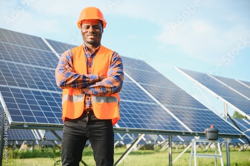 African american man in safety helmet on solar panels with screwdriver. Competent technician using tools while performing service work on station