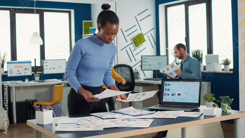 African american startup employee looking at business papers with data charts comparing two sheets with statistics on laptop screen. Woman standing in finance department analyzing profit indicators.