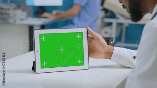African american therapist man holding mock up green screen chroma key tablet with isolated display in horizontal position while analyzing sickness expertise in hospital office. Medicine concept