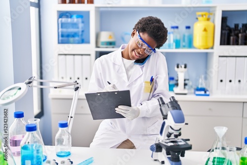 African american woman wearing scientist uniform talking on the smartphone write on clipboard at laboratory