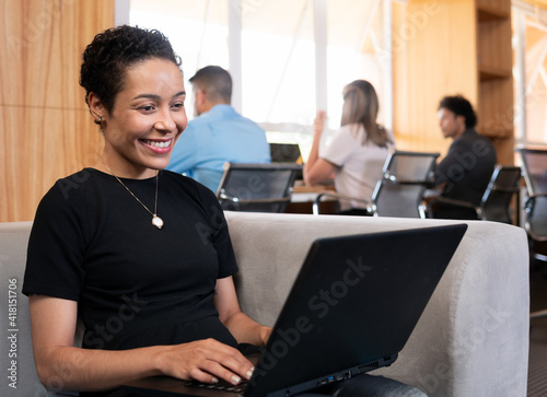 african american woman working and typing in laptop on sofa in office lobby. .