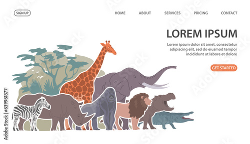 African animals set. Big elephant, giraffe, rhinoceros, lion and zebra. Herbivorous and carnivorous. Wildlife mammal. Fauna zoology. Flat vector collection illustration. Design for banner, website