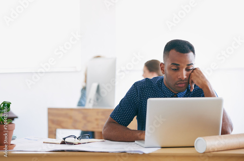 African, businessman and laptop with office, bored and tired with work. Architect, technology and paperwork with computer, fatigue and startup or small business with plans for entrepreneurship
