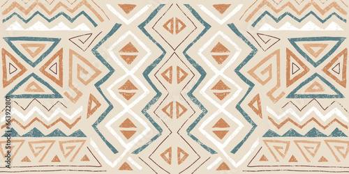 African ethnic seamless pattern in tribal style. Trendy abstract geometric background with grunge texture. Unique design elements for textile, banner, cover, wallpaper, wrapping