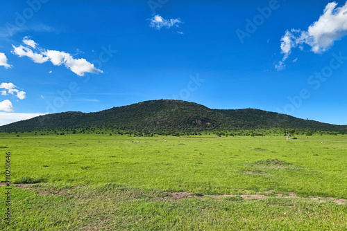 African landscape. The endless savanna is covered with green grass. Countless herds of herbivores graze. On the horizon is a mountain range. There are picturesque cumulus clouds in the sky. Kenya.