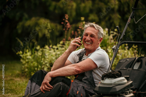After a long day of outdoor chores, a senior homeowner enjoys a peaceful evening in his backyard, checking messages on his mobile device
