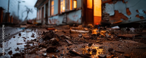 Aftermath of a natural disaster with damaged buildings and debris, Historical, Earthy tones, Photography