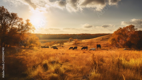 Afternoon in a Colorful Green Field with Animals, Tranquil Landscape with Dry and Green Grass. Generative AI