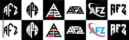 AFZ letter logo design in six style. AFZ polygon, circle, triangle, hexagon, flat and simple style with black and white color variation letter logo set in one artboard. AFZ minimalist and classic logo