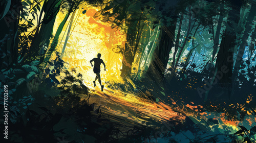 Against a backdrop of dramatic light and shadow, a runner moves through a thick, fairytale forest enveloped in mystery