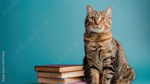 Against a gradient background, a chubby cat with a perplexed expression sits next to a toppled stack of books, its comically exaggerated confusion evident in its wide eyes and raised eyebrows