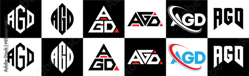 AGD letter logo design in six style. AGD polygon, circle, triangle, hexagon, flat and simple style with black and white color variation letter logo set in one artboard. AGD minimalist and classic logo