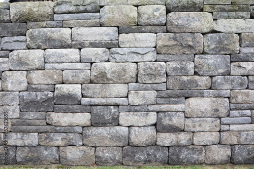 Aged and weathered stone brick wall background texture with a rugged and rustic appearance