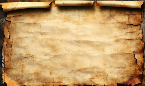 Aged parchment scroll on dark wood, blank space, history background, design element