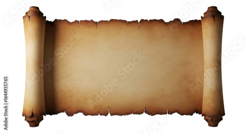 Aged parchment scroll with frayed edges and rolled ends isolated on a transparent background paper