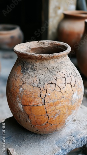 Aged terracotta pot with cracks showcasing rustic clay texture in natural light