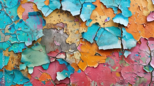 Aged wall with colorful peeling pieces of paint. Abstract wallpaper background. Created with