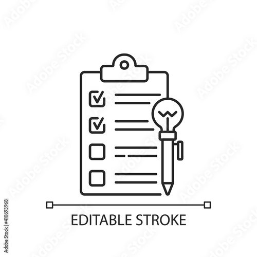 Agenda worksheet linear icon. Workshop icon. Time management tool. Efficient time using. Thin line customizable illustration. Contour symbol. Vector isolated outline drawing. Editable stroke