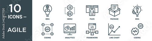 agile outline icon set includes thin line idea, menu, files, package, idea, coding, analytics icons for report, presentation, diagram, web design