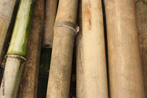 Aging bamboo stalks showing a natural gradient from green to brown, highlighting organic textures and color transitions in a tropical setting