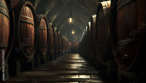 Aging wooden barrels in a dimly lit traditional wine cellar with rustic stone walls and atmospheric lighting
