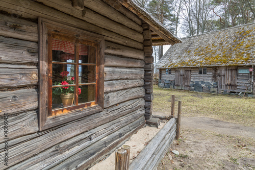 Agricultural buildings of wood and stone with thatched roofs