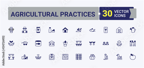 Agricultural Practices icon set. Contain linear sign farming, harvest, veg, vegetable, farmland, plant. Farm And Farming icon. Modern icons collection. Art and illustration.
