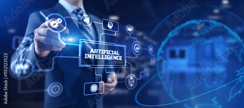 AI Artificial intelligence Neural network Machine learning modern technology concept. Businessman pressing button on screen.