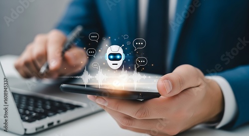 AI Chatbot Communication: Businessman Engaging with Artificial Intelligence on Smartphone for Seamless Digital Interaction and Automation Illustration