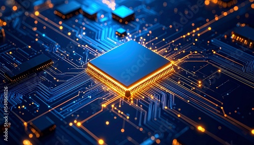 AI Chip on a Circuit Board with Glowing Connections and Data Pathways Illuminated in a High-Tech Environment.